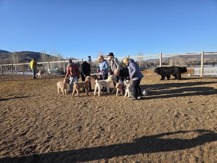 Birthday party five golden doodles and their mom. Freddie, not invited, sulks in the background. I felt very badly for Freddie that he was excluded in this shameful manner.