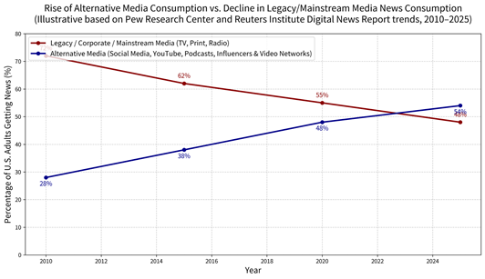 The chart above visualizes the long-term shift in U.S. news consumption. The red line shows the decline in reliance on legacy/corporate/mainstream media (primarily TV, print newspapers, and traditional radio). The blue line shows the corresponding rise in alternative media (social media platforms, YouTube, video networks, podcasts, and content from independent creators/influencers).