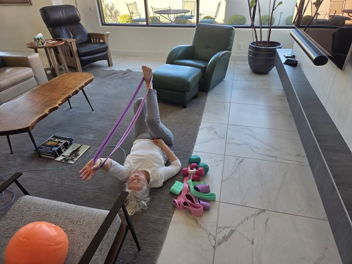 AM routine. TIMDT"s virtual training session with Jada, her trainer of fourteen years. Jada is face timing from Park City, UT.