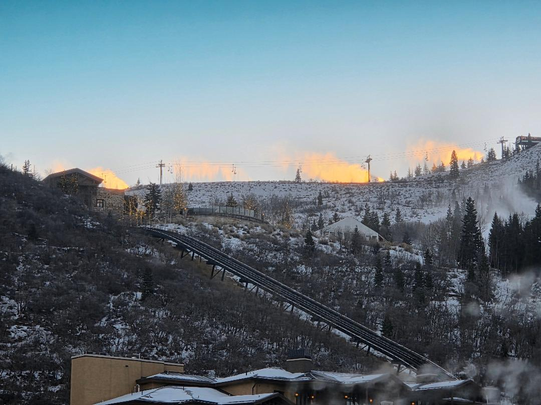 "Snowing" at Mountaineer Lift (background). St. Regis Hotel funicular, foreground.
