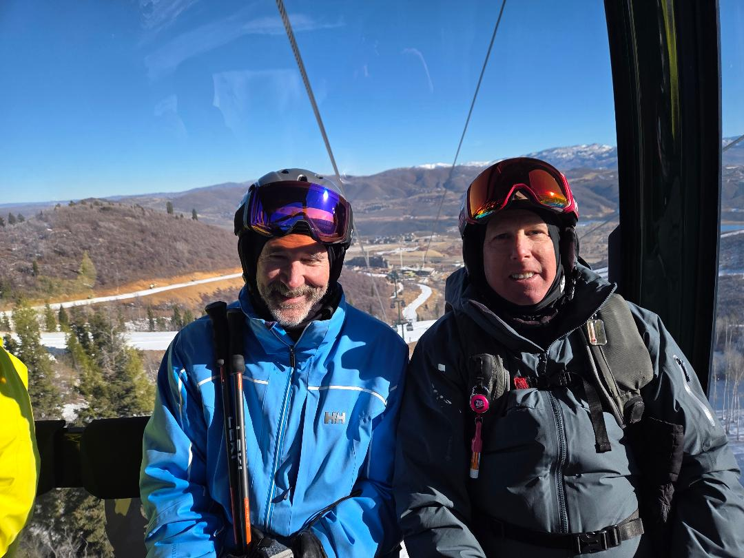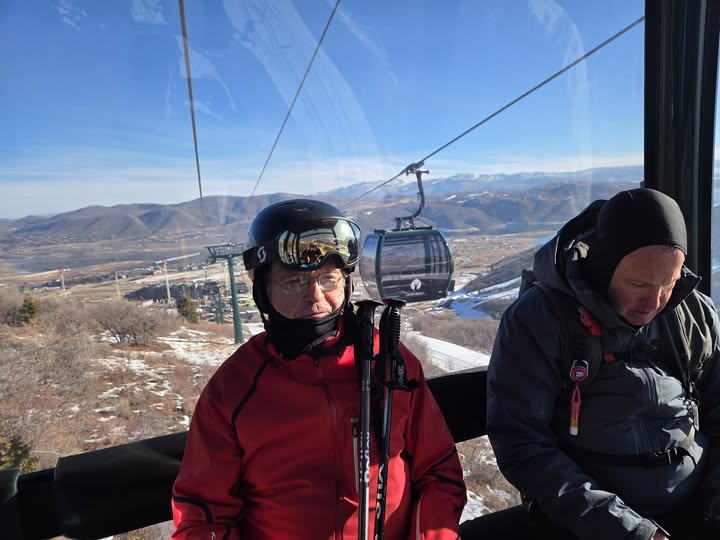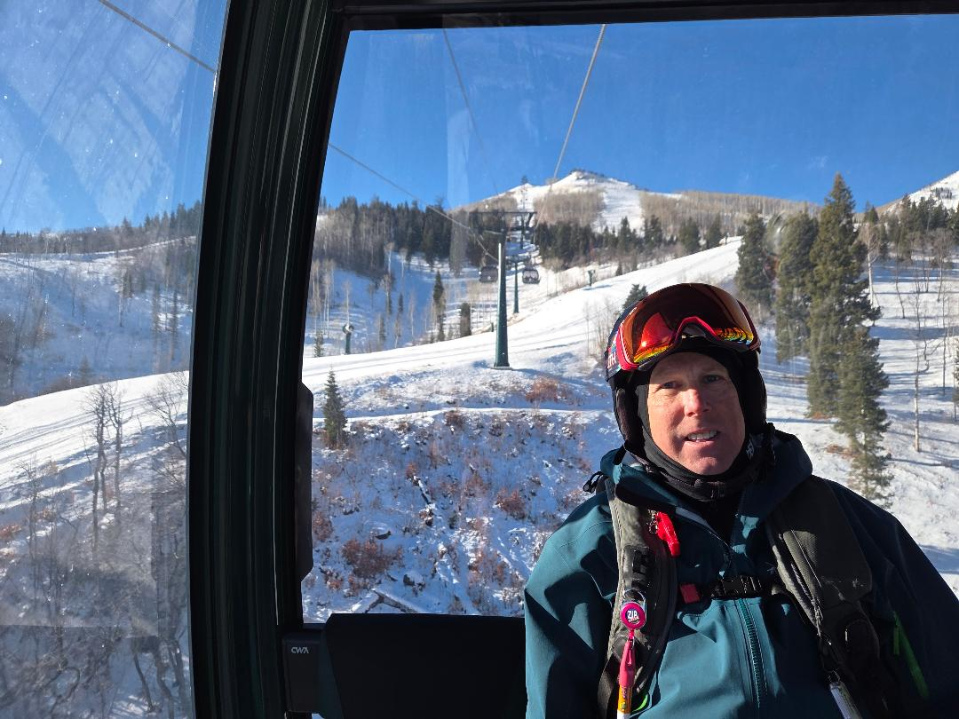 With PGA in East Village Gondola. On our way to Park Peak. Fifteen minutes. 3.5 miles.