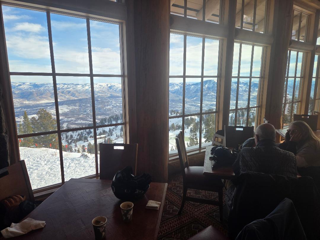 Snowbasin. One hour's drive north of Park City. I drove the Sprinter. Skiing with Espresso. Putting IKON Pass to use. Unfamiliar resort so I need to be more careful. Ski from orange sign to orange sign. Stop. Survey the scene and then proceed. Need for care augmented a bit pre break due flat light. Post break, better light, but also rapidly softening snow in warm temps. Still a good day with adequate calories burned, work on skills, and camaraderie with friend. Lunch on way back at Taggert's in Morgan County.