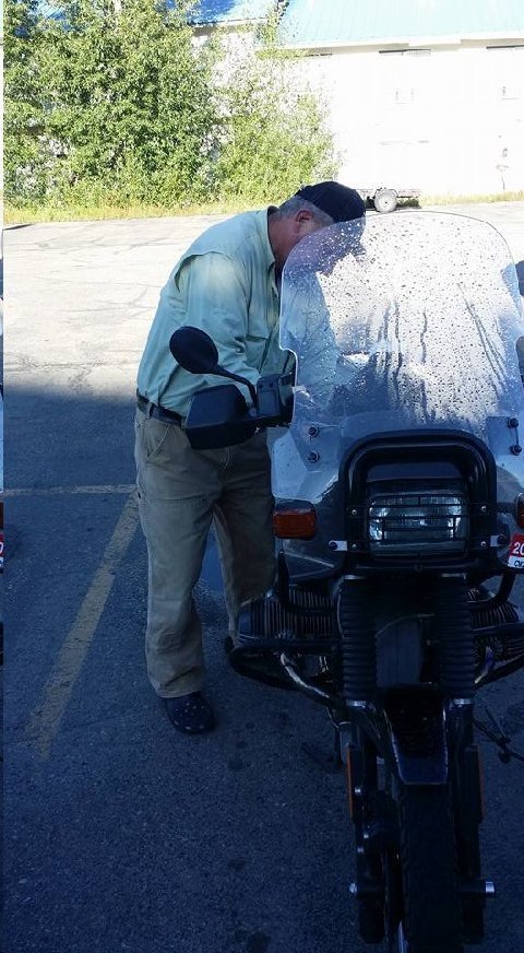 Above: Bavarian Dog can't leave for his Pueblo, CO home and cyber security business until he plugs a punctured rear tire of his GS. 12 August 2015. Supreme Dog (Dr. G) observes.