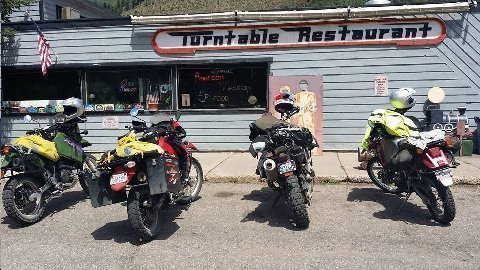 Above: World first. Four adventure bikes with tag sequence never before seen at Turntable Restaurant in Minturn, CO. 10 August 2015.